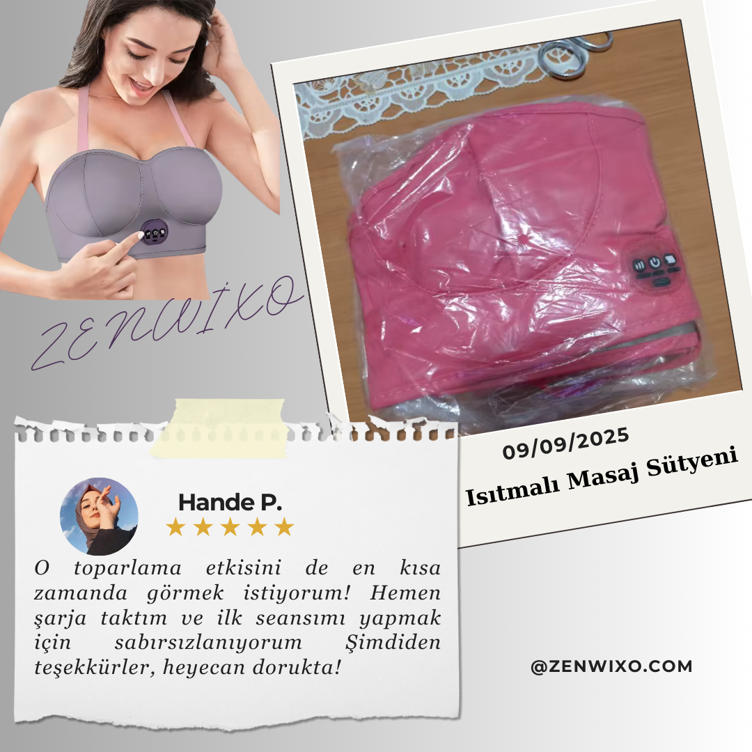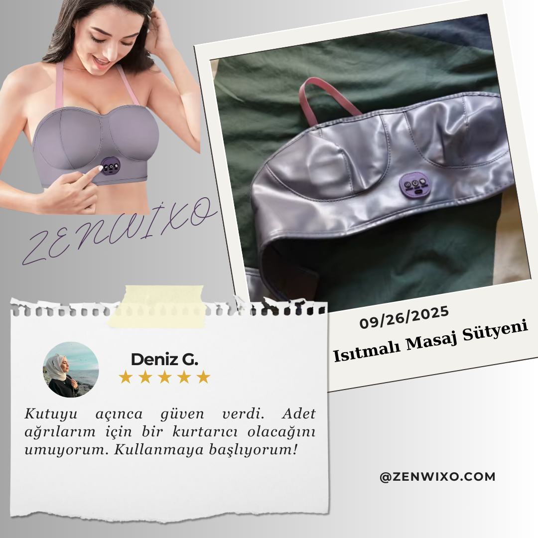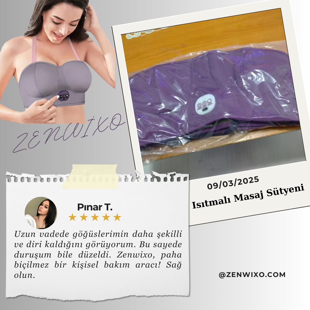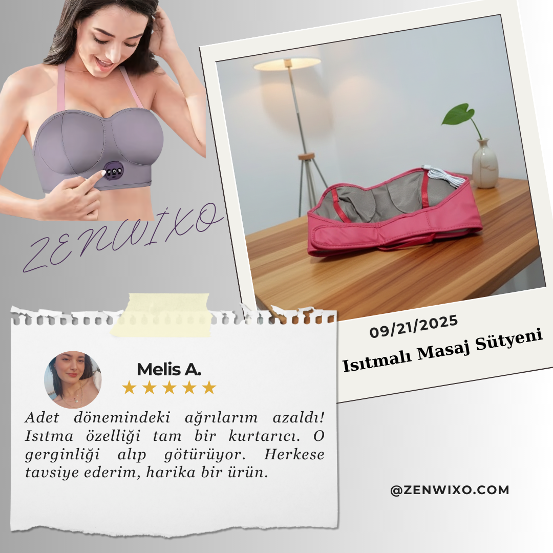 Zenwixo Masaj Sütyeni, titreşimli masaj ve sıcak kompres özelliğiyle göğüs dokunu desteklemeye yardımcı olur.